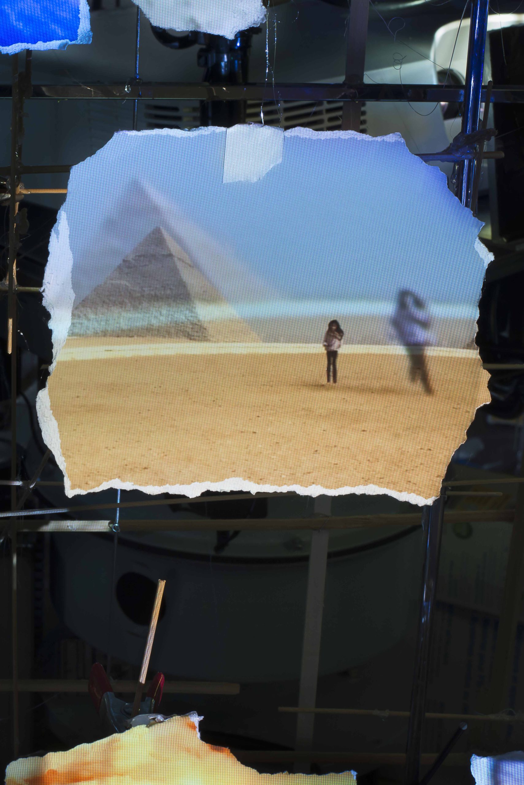 Née en 1969 à Boston, Sarah Sze vit et travaille à New York. Ses installations, souvent monumentales, prennent l’apparence d’un microcosme complexe d’objets et de matières, qui dessinent ensemble des formes globales simples. À l’instar de son installation Triple Point (Observatory) à la Biennale de Venise en 2013, les installations originales créées à la Fondation Cartier cette année impliquent une déambulation. Tracing Fallen Sky est de ce registre. Posée au sol, mesurant deux mètres de diamètre et rehaussée d’un pendule en balance au-dessus de l’ensemble, cette œuvre à l’allure cosmique est composée d’objets hétéroclites : du sel, de la peinture, ainsi qu’un assemblage de morceaux d’acier qui suggèrent une terre aride. D’apparence, on pourrait penser à un inventaire à la Prévert, mais dans Tracing Fallen Sky chaque élément parle du processus de création de l’œuvre et questionne notre rapport ambivalent au temps. L’œuvre la plus grande de l’exposition, Twice Twilight, évoque dans sa structure un planétarium, la Terre aussi. À la manière d’un nid d’oiseau, des branches (de bambou et de métal) s’entremêlent et laissent pendre des papiers sur lesquels sont imprimées des images ou projetées des vidéos. Ce hub d’images s’étend aussi dans l’espace du rez-de-chaussée, des projections vidéo étant également faites sur les parois vitrées du bâtiment. Les images que le spectateur capte par bribes sur les murs et sur les papiers déchirés de l’installation ont été glanées sur Internet ou prises par l’artiste. Elles représentent des éléments de la nature — terre, feu, eau — dans ses actions les plus anodines, à savoir le mouvement des nuages, la croissance d’une plante…