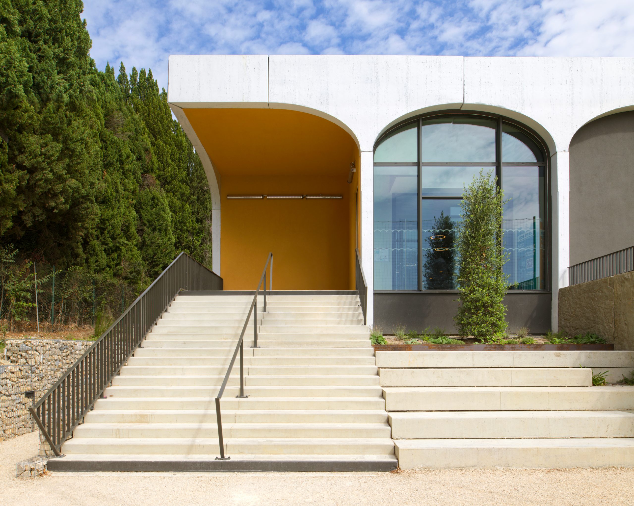 Inspiré par les vestiges de Glanum et les aqueducs romains, le bâtiment déploie sur sa façade une série d’arcades en béton matricé, jouant avec la lumière du sud. Cette trame répétitive, à la fois monumentale et légère, relie l’équipement à la mémoire du territoire tout en lui conférant une présence intemporelle.