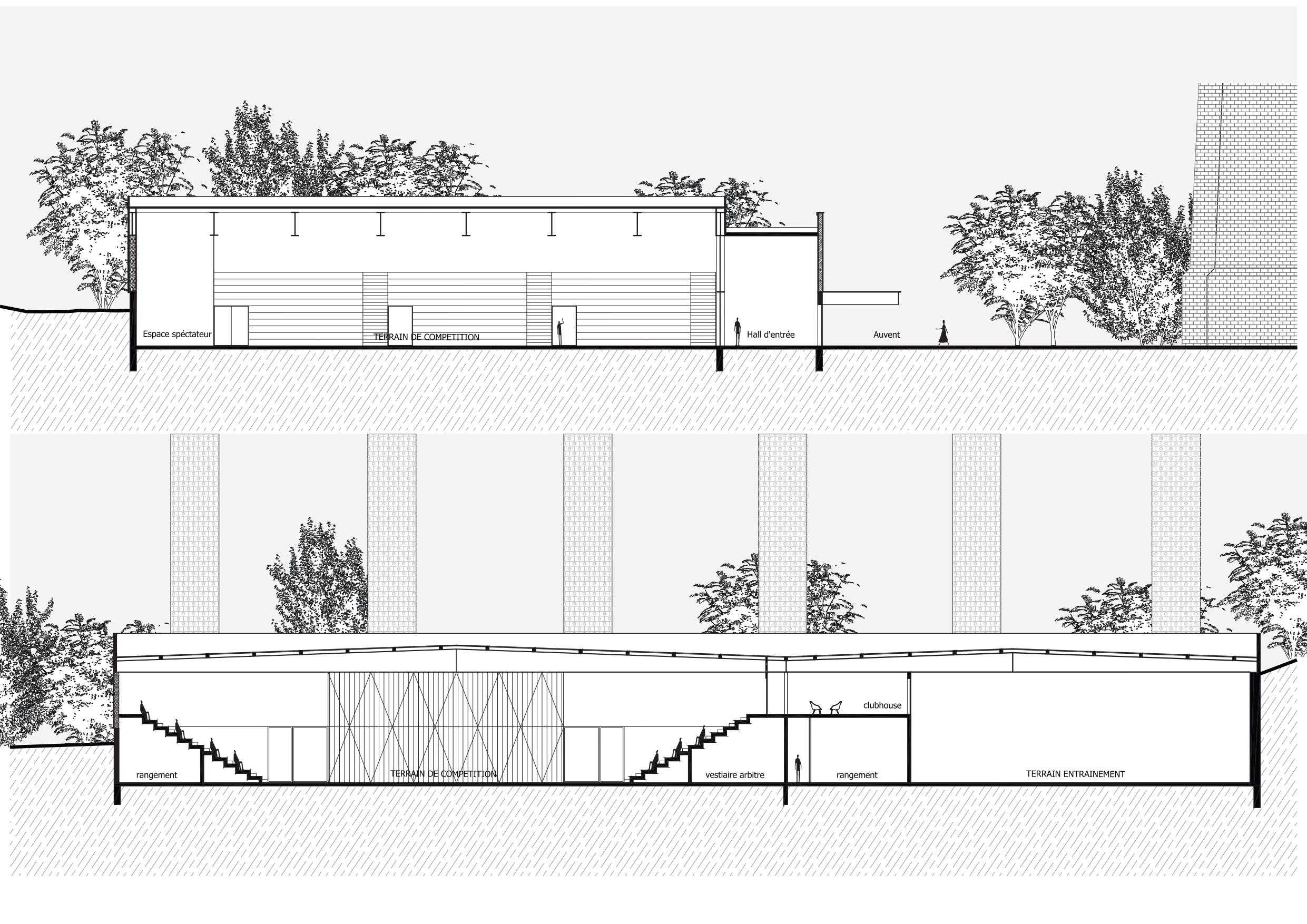 Orienté vers le cheminement doux longeant la rivière, le complexe développe des espaces accessibles et appropriables par tous, quels que soient les usages, les mobilités ou les pratiques sportives. À l’intérieur comme à l’extérieur, la sobriété des volumes et le choix de matériaux pérennes traduisent une recherche d’équilibre entre confort, durabilité et qualité d’usage.