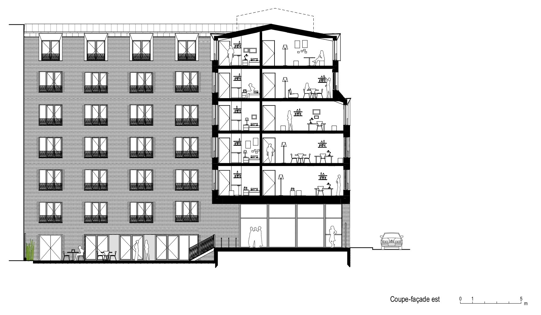L’entrée se fait par un porche généreux, qui signale le passage d’un espace public à un monde plus calme. Cette séquence d’accueil s’ouvre sur un jardin en cœur d’îlot, autour duquel s’articulent les espaces communs : salle polyvalente, bureaux associatifs, lieux de rencontre. Les circulations, baignées de lumière naturelle, desservent des studios compacts mais soigneusement agencés, tous orientés vers la tranquillité intérieure. De larges baies vitrées permettent une relation apaisée à l’extérieur, sans exposition directe aux regards. La qualité de l’air, la lumière, l’ergonomie sont autant de composantes du soin porté à l’habitabilité.