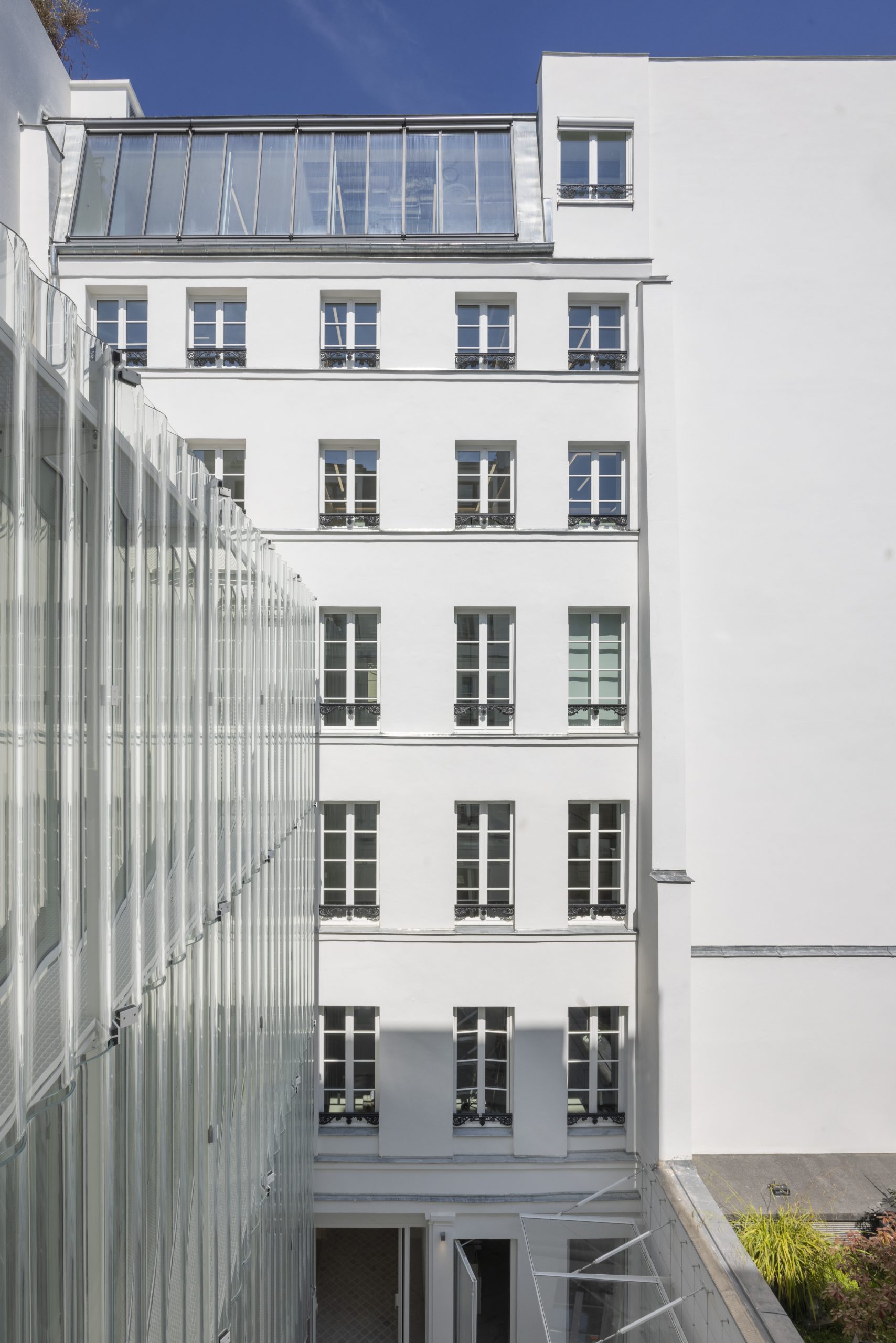 Malgré sa hauteur de 6,40 m, le volume supérieur offre un aspect aérien grâce aux modules de cassettes de teinte métallique et lumineuse.