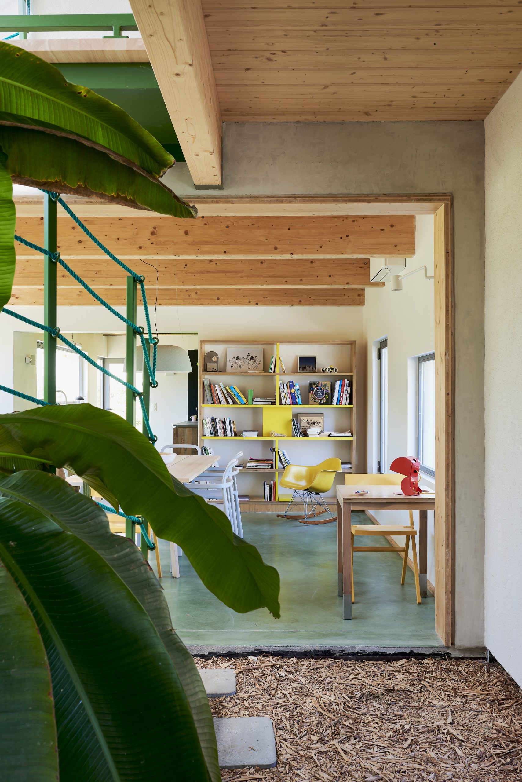 Depuis le hall, un escalier monumental dessert l’étage en mezzanine par le biais d’une passerelle, lieu de transition par définition. Judicieusement placée à la croisée des espaces, celle-ci constitue un point de vue agréable pour admirer la rue intérieure et les perspectives sur les espaces arborés.