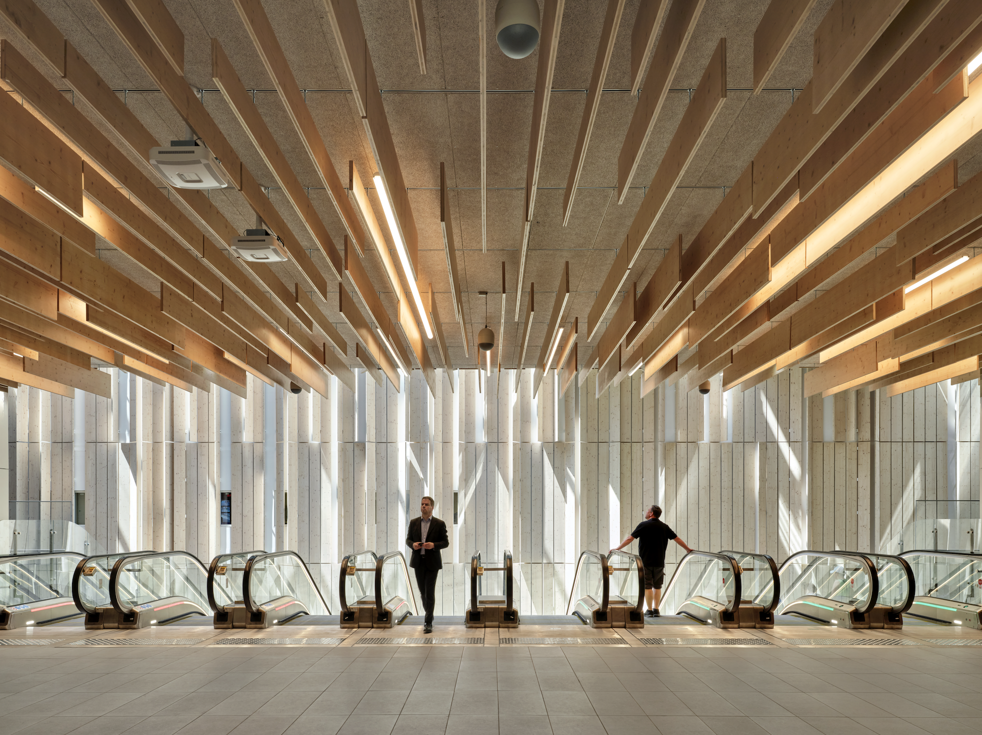 Malgré l’animation de cette gare, l’endroit paraît en dehors du tumulte des transports. Les parois de cette cavité sont habillées de panneaux d’épicéa. Ce revêtement apporte une qualité acoustique et une chaleur matérielle dans un univers autrement dominé par le béton, l’aluminium et le verre. Le bois est ici utilisé pour adoucir la perception des profondeurs et pour, plus avant, tranquilliser l’expérience urbaine des transports collectifs. À l’échelle d’un ouvrage souterrain, c’est un geste de confort autant que de clarté unique en son genre.