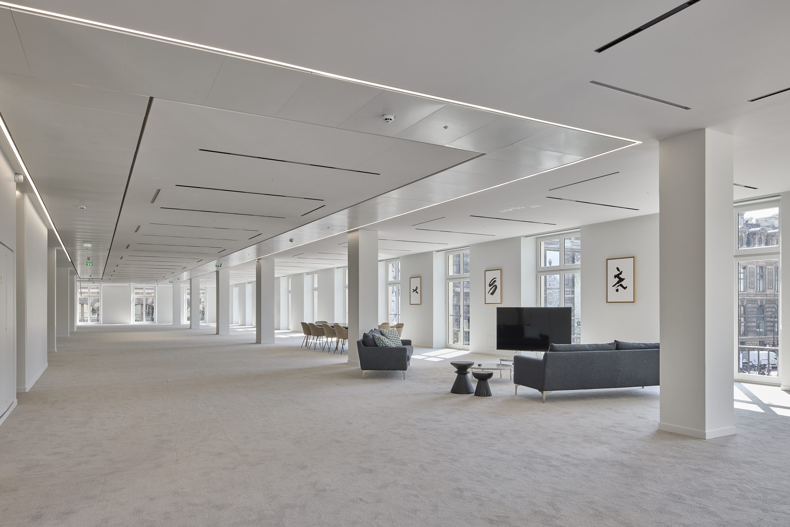 En effet, les espaces de bureaux représentent plus de surfaces que les espaces de la Fondation Cartier pour l’art contemporain. Nous nous sommes engagés dès 2020 dans une démarche d’amélioration du cadre de vie de l’ensemble des collaborateurs du Louvre Saint-Honoré, afin de compenser les cinq années de chantier qui ont rendu la vie dans l’immeuble moins facile. Nous avons notamment conçu un nouveau restaurant au premier étage, avec vue sur le Musée du Louvre, pour remplacer l’existant se trouvant en sous-sol. Nous avons également créé des espaces partagés au deuxième étage, un café réalisé par Ana Moussinet, et de grandes salles de réunion donnant sur des terrasses arborées. Demain, les salariés auront accès à un nouveau parking vélos ultra-moderne. Nous aimons l’idée que nos clients puissent trouver dans nos locaux autre chose que de simples espaces de travail. Nous avons voulu recréer une unité dans le bâtiment et des lieux où ils peuvent se croiser, échanger, créer. Il s’agissait aussi de donner envie aux locataires de rester et de traverser cette phase de chantier, en faisant remonter dans les étages de bureaux la modernité et le renouveau qui étaient en train de se jouer dans le socle. Nous avons travaillé sans relâche pour accompagner les locataires et pour que personne ne se sente lésé. L’un des enjeux essentiels du projet était de réunir les deux dimensions du site, let haut et le bas, pour faire un ensemble cohérent, vivant et harmonieux.